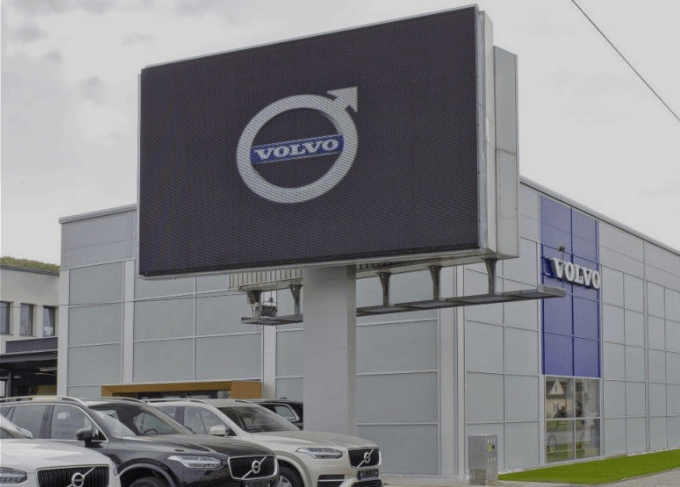 Velkoplošná reklamní LED obrazovka o rozměru 23 m2 (velikost 6,1 x 3,8 m) je umístěná u showroomu SPX-CAR